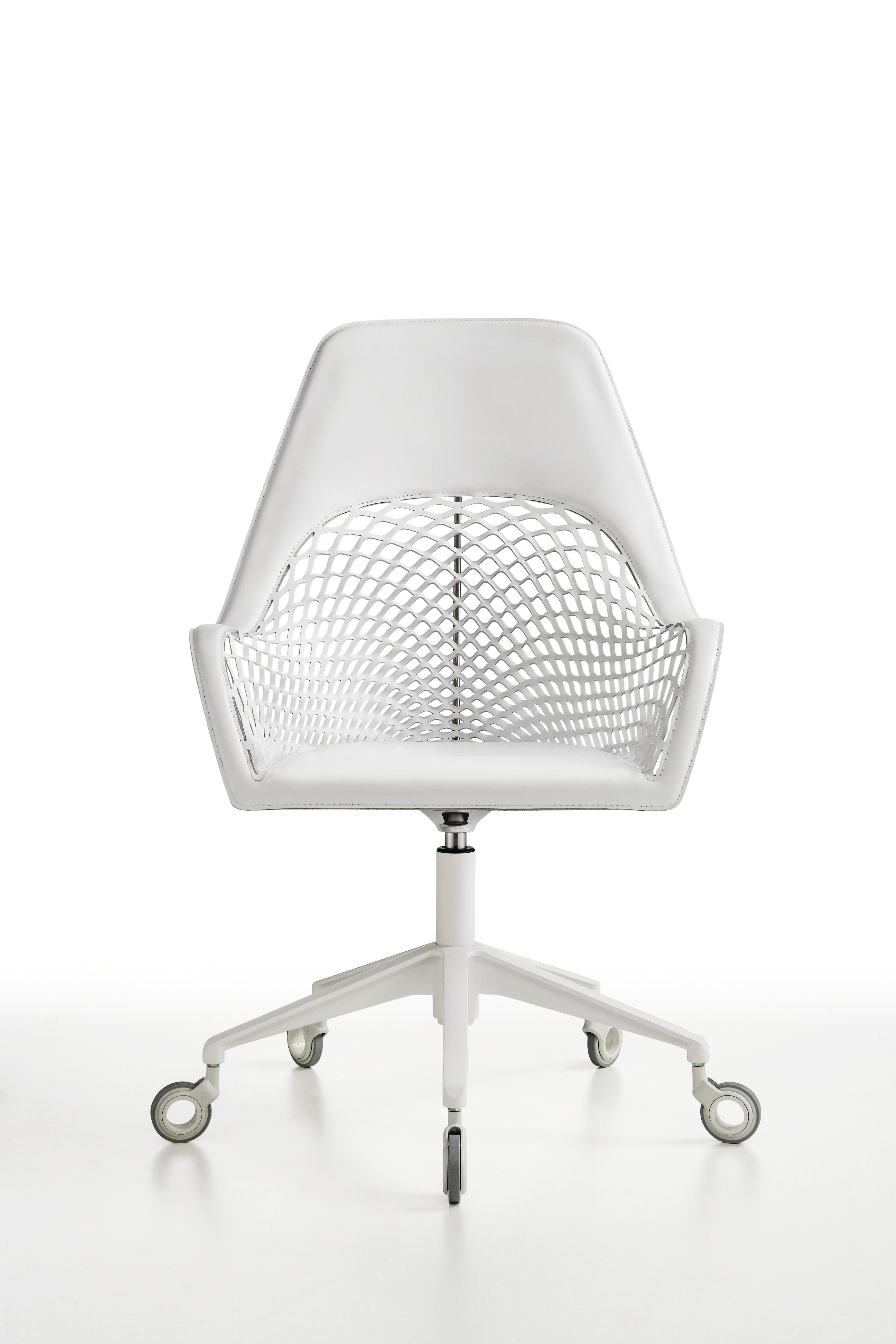 Hide Leather seat shell and innovative and strong laser-cut net of hide leather, stitched to the frame covering the backrest.