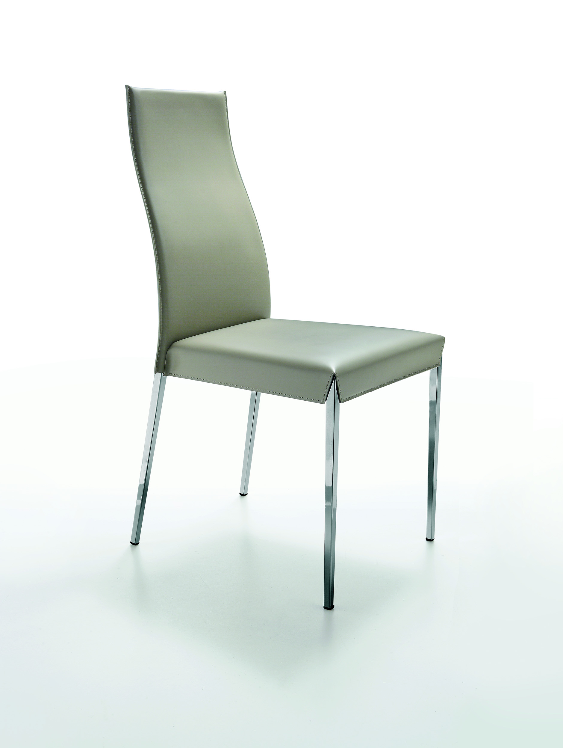 Chair with four-leg frame in chrome, white, aluminium or sand painted steel. Seat upholstered in hide, regenerated hide, leather, eco-leather, fabric or custom fabric. Available version with backrest in quilted eco-leather.